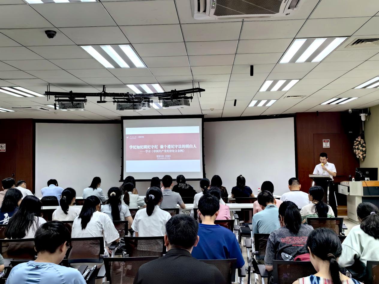 6月25日下午,学院党委书记李增祥在文俊东楼310为学院师生党员带来了一场主题为“学纪知纪明纪守纪 做个遵纪守法的明白人——学习《中国共产党纪律处分条例》”的专题党课。本次党课以学习《中国共产党纪律处分条例》(以下简称《条例》)为重点,旨在强化学院师生党员的纪律意识,进一步严明党的纪律规矩。学院班子领导,各支部书记、各办主任、行政党支部全体党员以及本科生党支部党员代表等60余人参加了党课。