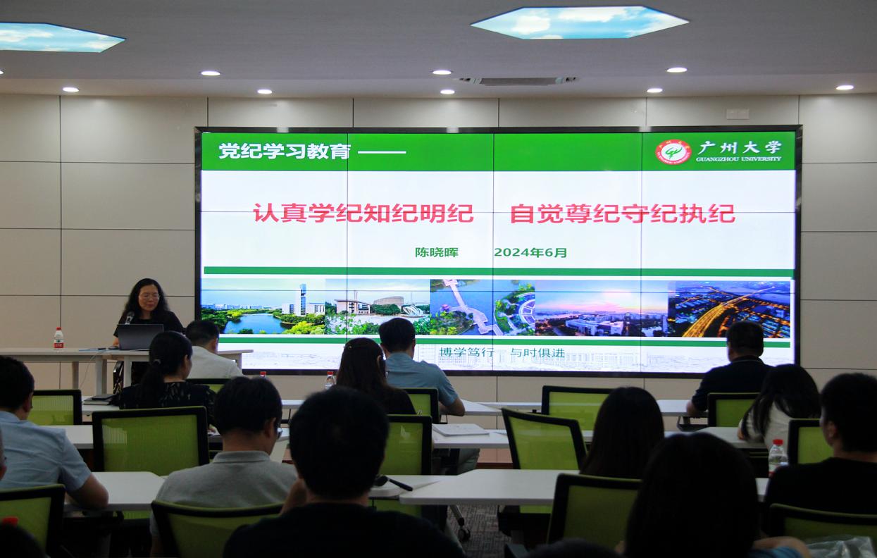 陈晓晖书记作题为《认真学纪知纪明纪 自觉尊纪守纪执纪》的专题辅导报告,从开展党纪学习教育的意义和要求、《中国共产党纪律处分条例》(以下简称《条例》)学习及案例警示、筑牢遵规守纪思想防线等三个方面展开授课。陈书记首先从党纪学习教育的重要性和必要性入手,深入阐释了开展党纪学习教育的重要意义。随后,结合典型案例详细、深入解读了《条例》的形成发展、完善历程、修订情况及新修订《条例》的亮点,指出全体党员要不断强化宗旨意识,厚植为民情怀,用心用力用情为师生办实事办好事,要明确师德底线,以德立身、以德立学、以德施教,为党育人,为国育才。
