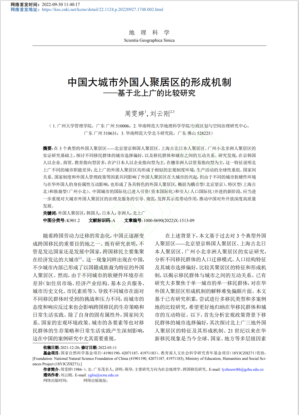 周雯婷博士(第一作者)与华南师范大学合作者的研究成果“中国大城市外国人聚居区的形成机制——基于北上广的比较研究”在地理学权威期刊《地理科学》2022年第9期发表。论文成果受到国家自然科学基金项目(41901190)和教育部人文社会科学基金项目(18YJCZH271)的资助。《地理科学》入选CSSCI、CSCD、JST、WJCI、AMI核心、北大核心,位列捷克论坛