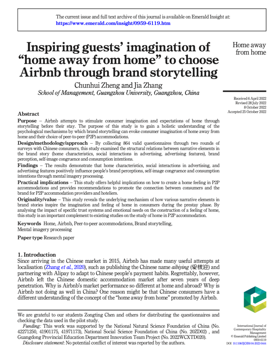 郑春晖副教授以第一作者身份在国际顶级SSCI期刊《International Journal of Contemporary Hospitality Management》发表了题为“Inspiring guests’ imagination of “home away from home” to choose Airbnb through brand storytelling”(通过品牌叙事激发客人对“家外之家”的想象,进而选择Airbnb)的研究成果。论文研究受到国家自然科学基金(编号42271250,41901175和41971173)、国家社会科学基金(编号20ZD02)和广东省教育厅创新团队项目(编号2022WCXTD020)的资助。郑春晖副教授为本文第一作者,其指导的硕士生张佳为第二作者。