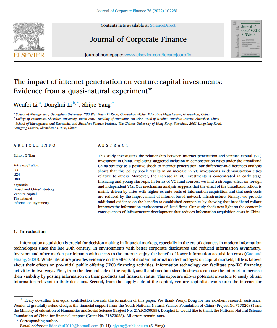 教师黎文飞副教授(第一作者)和合作者的研究成果“The impact of internet penetration on venture capital investments: Evidence from a quasi-natural experiment”在公司金融国际一流权威期刊《Journal of Corporate Finance》发表。该期刊位列JCR一区,ABS期刊列表4星,ABDC期刊列表A*级。该研究受到国家自然科学基金青年项目(71702038)和教育部人文社科青年基金(21YJC630055)等的资助。