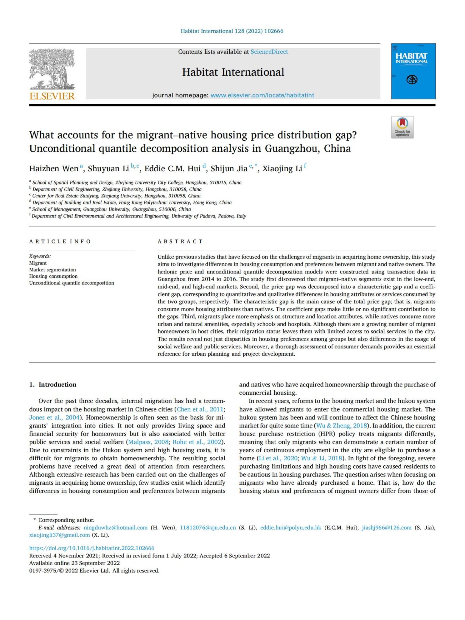 贾士军教授(通讯作者)和浙江大学温海珍教授合作的科研成果“What accounts for the migrant-native housing price distribution gap? Unconditional quantile decomposition analysis in Guangzhou, China”在国际知名期刊《Habitat international》发表。合作者另有浙江大学房地产研究中心的Li Shuyuan博士,香港理工大学建筑与房地产系的Eddie Chi-man Hui教授和帕多瓦大学ICEA系的在读博士生李晓靖。《Habitat International》为SSCI检索,最新影响因子为5.369,在城市研究领域(URBAN STUDIES)中排名6/72,在区域和城市规划领域(REGIONAL & URBAN PLANNING)排名4/51,是JCR一区和中国科学院一区。