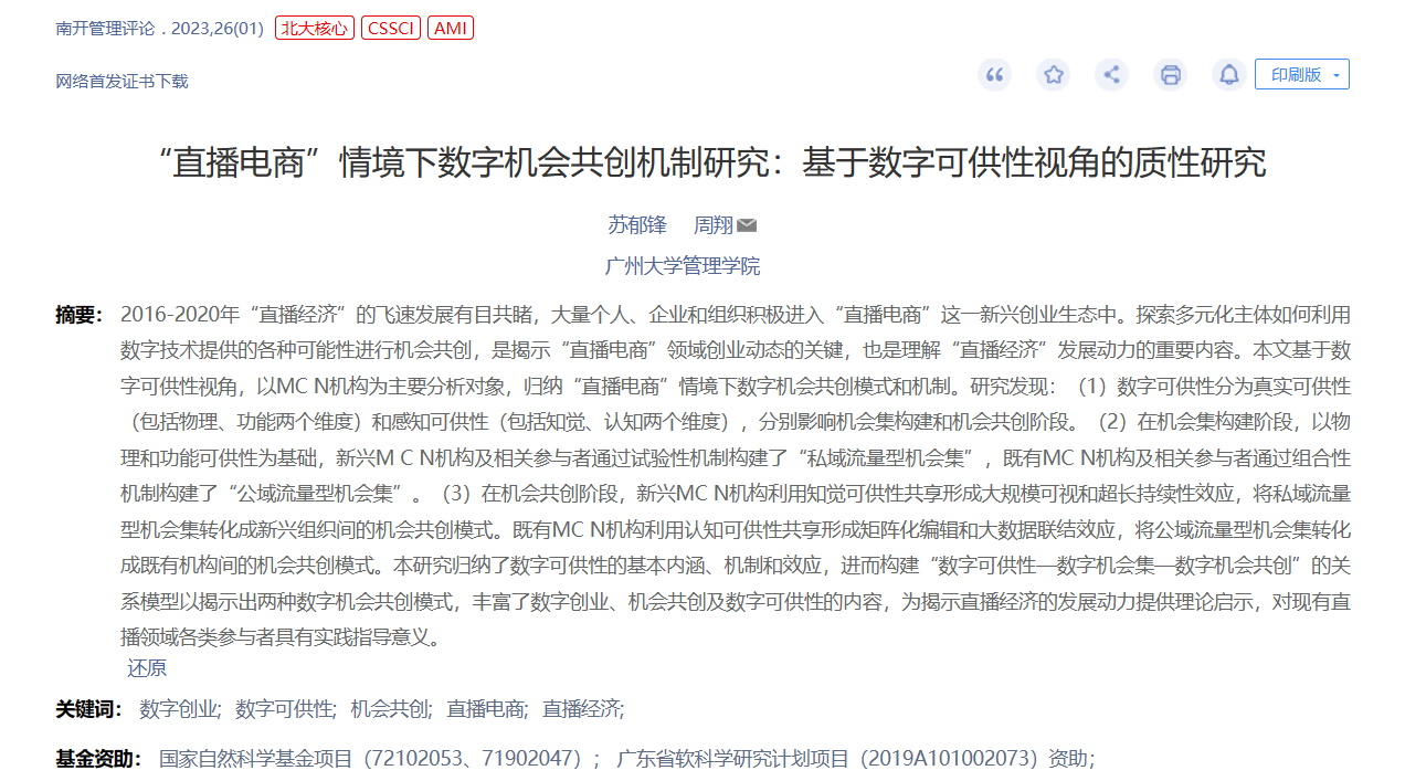 副教授苏郁锋(第一作者)、周翔(通讯作者)合作撰写的论文《“直播电商”情境下数字机会共创机制研究:基于数字可供性视角的质性研究》于国内权威核心期刊《南开管理评论》2023年第1期第26卷发表。《南开管理评论》是CSSCI收录期刊,影响因子为8.882,AMI评级为“权威”,同时被“国家自然科学基金委管理科学部”认定为30本重要期刊之一。
