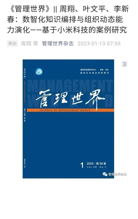教师周翔博士(第一作者)与合作者的研究成果《数智化知识编排与组织动态能力演化——基于小米科技的案例研究》在中国管理学顶级期刊《管理世界》发表。该期刊是中国社会科学院中国社会科学评价中心选出的管理学唯一顶级期刊、在南京大学中国社会科学研究评价中心(CSSCI)排名首位,是捷克论坛