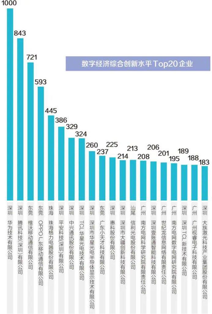 数字经济综合创新水平前20强企业中,华为技术有限公司位列第一(创新水平1000),腾讯科技(深圳)有限公司位列第二(创新水平843),两家企业均位于深圳;维沃移动通信有限公司位列第三(创新水平721),OPPO广东移动通信有限公司位列第四(创新水平593),第3、4名企业均位于东莞;位于珠海的珠海格力电器股份有限公司位列第五(创新水平445)。