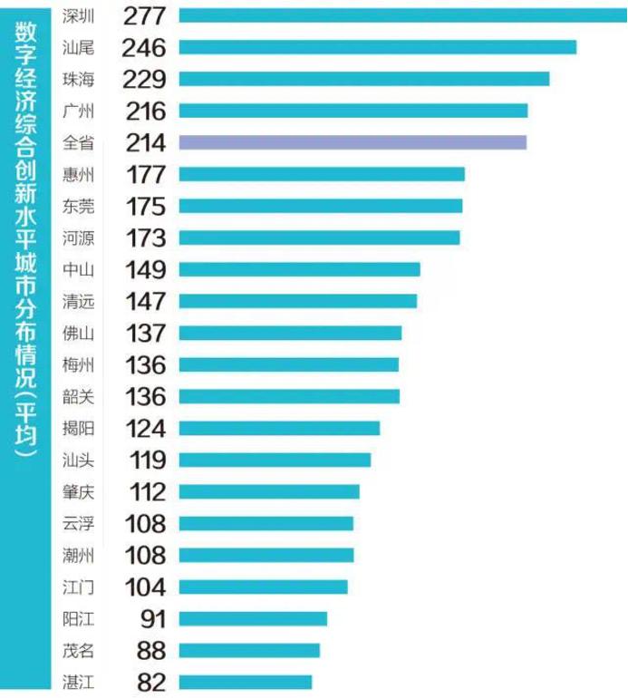从数字经济综合创新水平城市排名情况来看,“一核”珠三角9市位于全省前列,其中深圳、广州、东莞、佛山、珠海位于前五位;