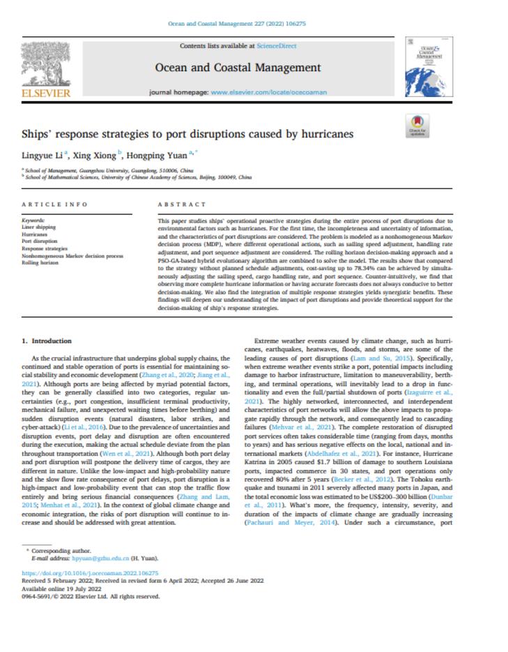 袁红平教授(通讯作者)和李凌跃博士(第一作者)合作发表了题为“Ships’response strategies to port disruptions caused by hurricanes”的研究成果。该论文发表于工程管理领域国际知名期刊Ocean & Coastal Management,期刊为SCI检索,最新影响因子为4.295,是JCR一区,在海洋学(OCEANOGRAPHY)领域期刊中排名8/66,在水资源(WATER RESOURCES)领域中排名25/100。