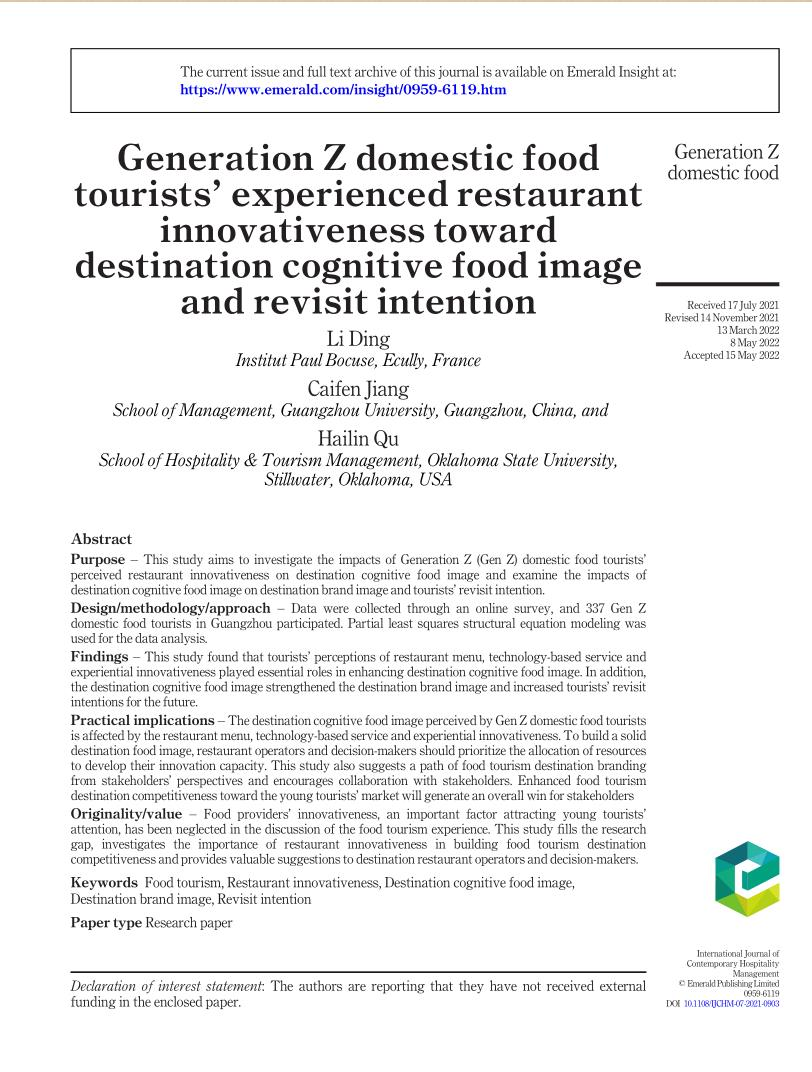 该论文的合作者包括Institut Paul Bocuse in France的Li Ding助理教授和Oklahoma State University的Hailin Qu教授。该论文主要采用问卷调查的研究方法,研究Z世代消费者感知中的餐厅创新措施对广州美食形象的影响。本研究发现,餐厅菜单、基于技术的服务和体验创新在提升广州美食形象方面发挥了至关重要的作用。Z世代消费者对广州作为旅游目的地城市的美食形象认知有利于增强美食之都的品牌形象,并由此提升了重游意愿。过去美食体验的研究忽视了对食品供应商的创新性讨论。该研究调查餐饮创新在打造美食旅游目的地中的重要性,提出餐厅经营者和决策者应优先考虑分配资源以发展其创新能力,并为目的地餐厅经营者和决策者提供有价值的建议。