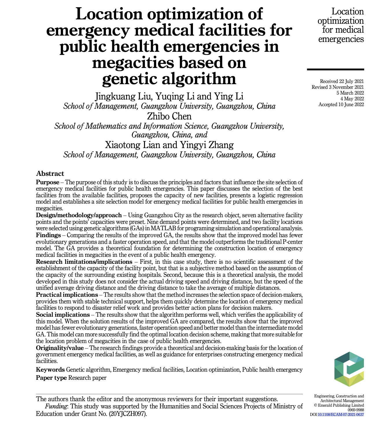 刘景矿副教授(第一作者和通讯作者),带领2018级工程管理专业本科生李雨晴、李颖、张东羽、连晓彤、张颖仪,以及2017级数学与信息科学学院本科生陈梓博合作发表了题为“Location optimization of emergency medical facilities for public health emergencies in megacities based on genetic algorithm”(基于遗传算法的特大城市突发公共卫生事件应急医疗设施选址优化)的研究成果。该论文发表于工程管理学科知名国际期刊Engineering, Construction and Architectural Management,SSCI/SCIE双检索期刊,最新影响因子为3.531,JCR二区期刊,论文链接://doi.org/10.1108/ECAM-07-2021-0637。