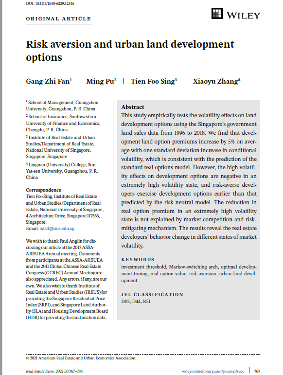 樊纲治教授与新加坡国立大学商学院程天富教授、西南财经大学蒲明教授、中山大学岭南学院张笑语博士团队的论文“Risk aversion and urban land development options”正式发表在房地产领域国际公认权威期刊《Real Estate Economics》2022年第50卷第3期上。《Real Estate Economics》是国际高质量学术期刊分级英国商学院协会ABS(the Association of Business School)分级的三星级期刊和澳大利亚商学院理事会ABDC(Australian Business Deans Council)分级的A类期刊,其2020年影响因子为3.418。