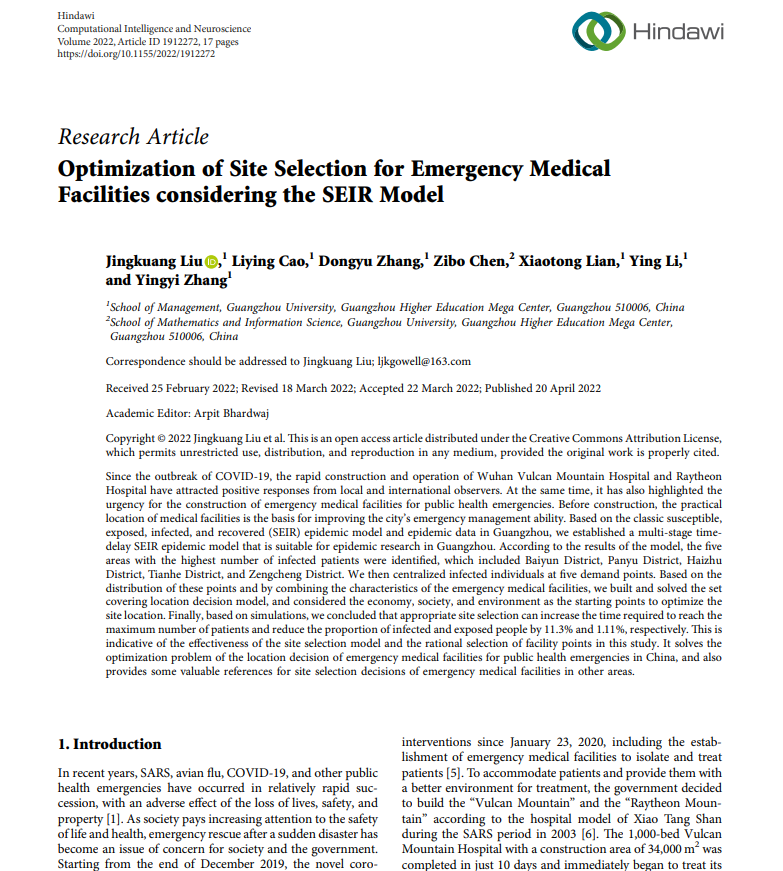 刘景矿副教授(第一作者和通讯作者),带领2018级工程管理专业本科生曹荔颖、张东羽、连晓彤、李颖、张颖仪等人合作发表了题为“Optimization of Site Selection for Emergency Medical Facilities considering the SEIR Model”(考虑SEIR模型的应急医疗设施选址优化研究)的研究成果。该论文发表于计算机与神经科学国际期刊Computational Intelligence and Neuroscience,SCI检索期刊,最新影响因子为3,.633,是JCR一区期刊,论文链接://doi.org/10.1155/2022/1912272。该研究成果作为第十七届“挑战杯”全国大学生课外学术科技作品竞赛项目“特大城市突发公共卫生事件应急医疗设施选址仿真研究”成果之一,获得了国赛二等奖,省赛一等奖。