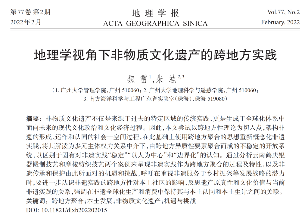 魏雷博士(第一作者)和地理科学与遥感学院朱竑教授(通讯作者)合作发表了题为“地理学视角下非物质文化遗产的跨地方实践”的研究成果。成果发表于《地理学报》,该期刊连续10年入选“中国最具国际影响力学术期刊,连续20年荣获“百种中国杰出学术期刊”,期刊复合影响因子和综合影响因子在2020年中国自然科学与工程技术类学术期刊中排名第1。该研究成果受到国家社会科学基金项目(21BGL259)等项目的资助。