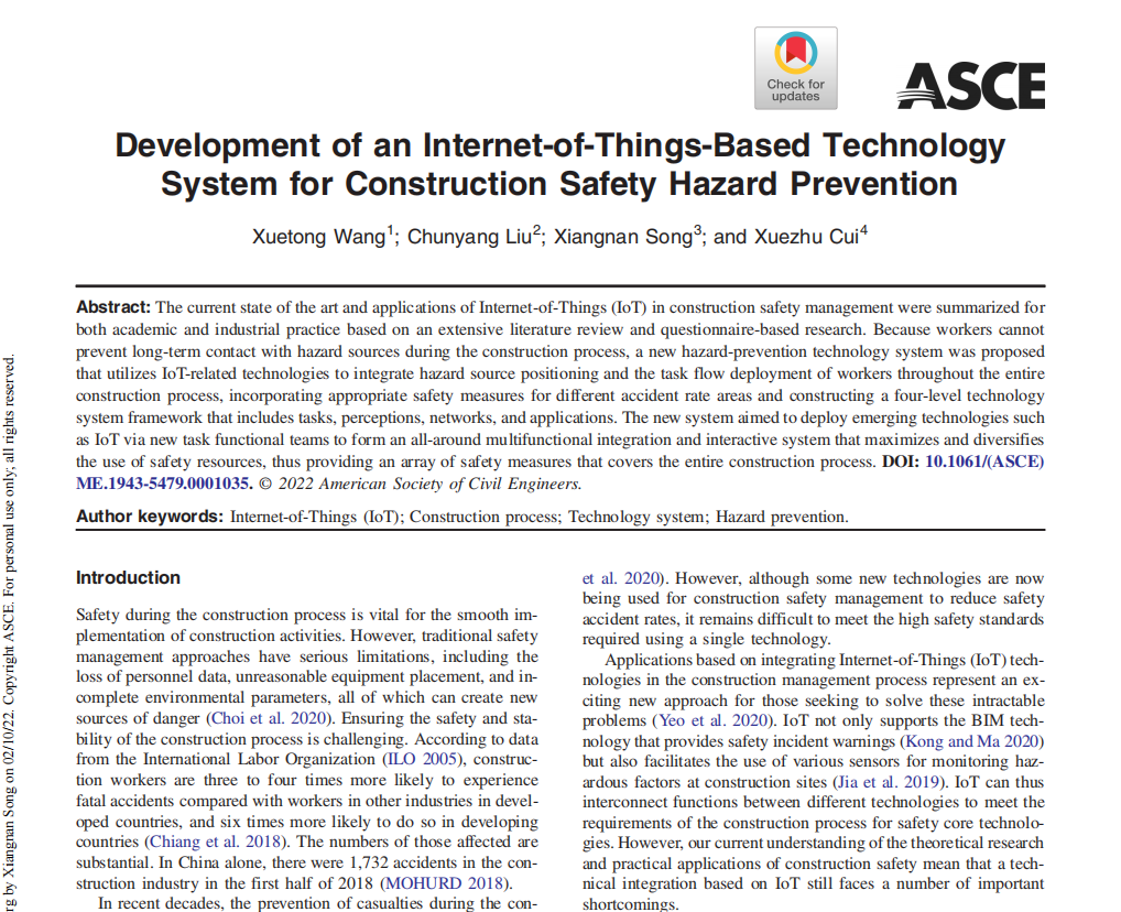 王学通教授(第一作者)和宋向南博士(通讯作者)合作发表了题为 “Development of an Internet-of-Things-Based Technology System for Construction Safety Hazard Prevention”的研究成果,合作者为捷克论坛