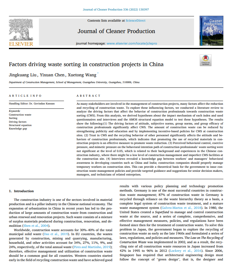 刘景矿副教授(第一作者)和王学通教授(通讯作者)合作发表了题为“Factors driving waste sorting in construction projects in China”(中国建设项目施工现场废弃物分拣驱动因素)的研究成果。该论文发表于工程和环境领域国际知名期刊Journal of Cleaner Production,期刊最新影响因子为9.297,在工程和环境(ENGINEERING, ENVIRONMENTAL)领域中排名第8,在绿色、可持续科学和技术(GREEN & SUSTAINABLE SCIENCE & TECHNOLOGY)领域中排名第7,是JCR一区和中国科学院一区期刊(基础版)。该研究受到教育部人文社科项目(20YJCJH097)、广东省“十三五”规划哲学社会科学规划项目(GD19CGL23)的资助。