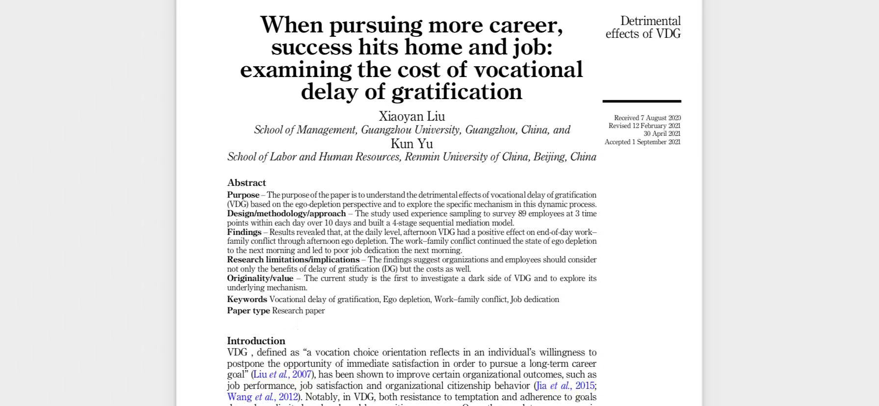 刘晓燕副教授以第一作者身份发表了题为“When pursuing more career, success hits home and job: examining the cost of vocational delay of gratification”(当追求成功伤害到家庭和工作:检验职业延迟满足的代价)的研究成果。该论文发表于国际期刊《Career Development International》,该期刊为SSCI检索,最新影响因子为3.792,五年影响因子为4.03,在管理学(PSYCHOLOGY,APPLIED)领域中排名第26/83,是JCR二区期刊。论文链接://doi.org/10.1108/CDI-08-2020-0204