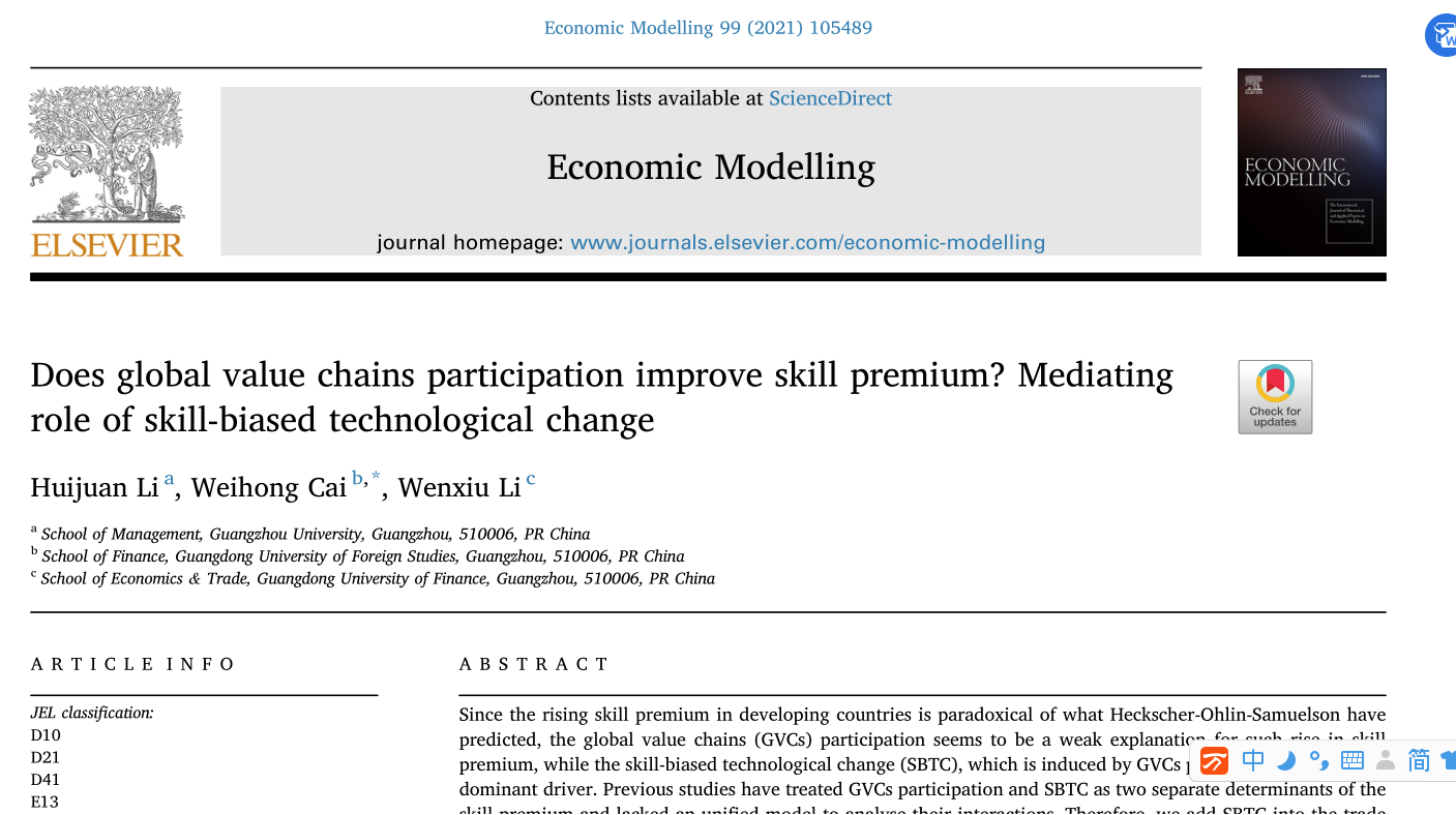李惠娟副教授以第一作者身份发表了题为“Does global value chains participation improve skill premium? Mediating role of skill-biased technological change”的研究成果。论文研究受到国家社会科学基金一般项目(20BJY096)的资助。该论文发表于国际期刊《Economic Modelling》,该期刊为SSCI检索,五年影响因子为3.412,在经济学领域中排名第89/377,是JCR一区期刊。