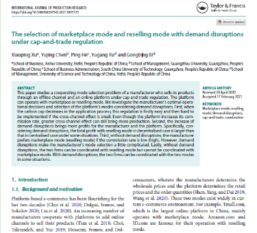 陈宇靖博士发表了题为“The selection of marketplace mode and reselling mode with demand disruptions under cap-and-trade regulation”的研究成果。该论文发表于国际期刊《International Journal of Production Research》,该期刊为SCI检索,最新影响因子为8.568,在运筹学与管理科学(Operations Research & Management Science)领域中排名第2/84,在工程和制造(Engineering, Manufacturing)领域排名第3/50,在工业工程(Engineering, Industrial)领域排名4/49,是JCR一区期刊,FMS列表B级期刊。陈宇靖博士为本文第二且通讯作者,第一作者为安徽大学徐小平教授,合作者还有华南理工大学何平教授、中国科学技术大学余玉刚教授和毕功兵教授。