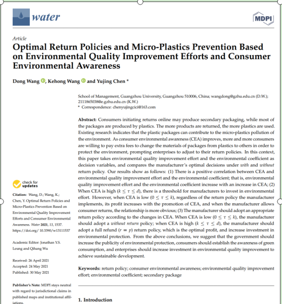 王东副教授发表了题为“Optimal return policies and micro-plastics prevention based on environmental quality improvement efforts and consumer environmental awareness”(基于环境质量努力与消费者环保感知的最优退货策略及微塑料污染控制)的研究成果。该成果发表于国际期刊《Water》,该期刊为SCI检索,2020年影响因子为3.103,是JCR二区期刊。论文链接为://doi,org/10.3390/w13111537。 王东副教授为本文第一作者,硕士研究生王科宏为本文第二作者,陈宇靖博士为本文通讯作者。本文受到国家自然科学基金项目(71731010,71801056,71801059,71802063),以及教育部人文社科项目(18YJC630017)的资助。