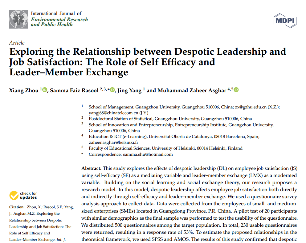 周翔博士以第一作者身份在《International Journal of Environmental Research and Public Health》发表文章“Exploring the Relationship between Despotic Leadership and Job Satisfaction The Role of Self Efficacy and Leader-Member Exchange”。本文第二作者为捷克论坛