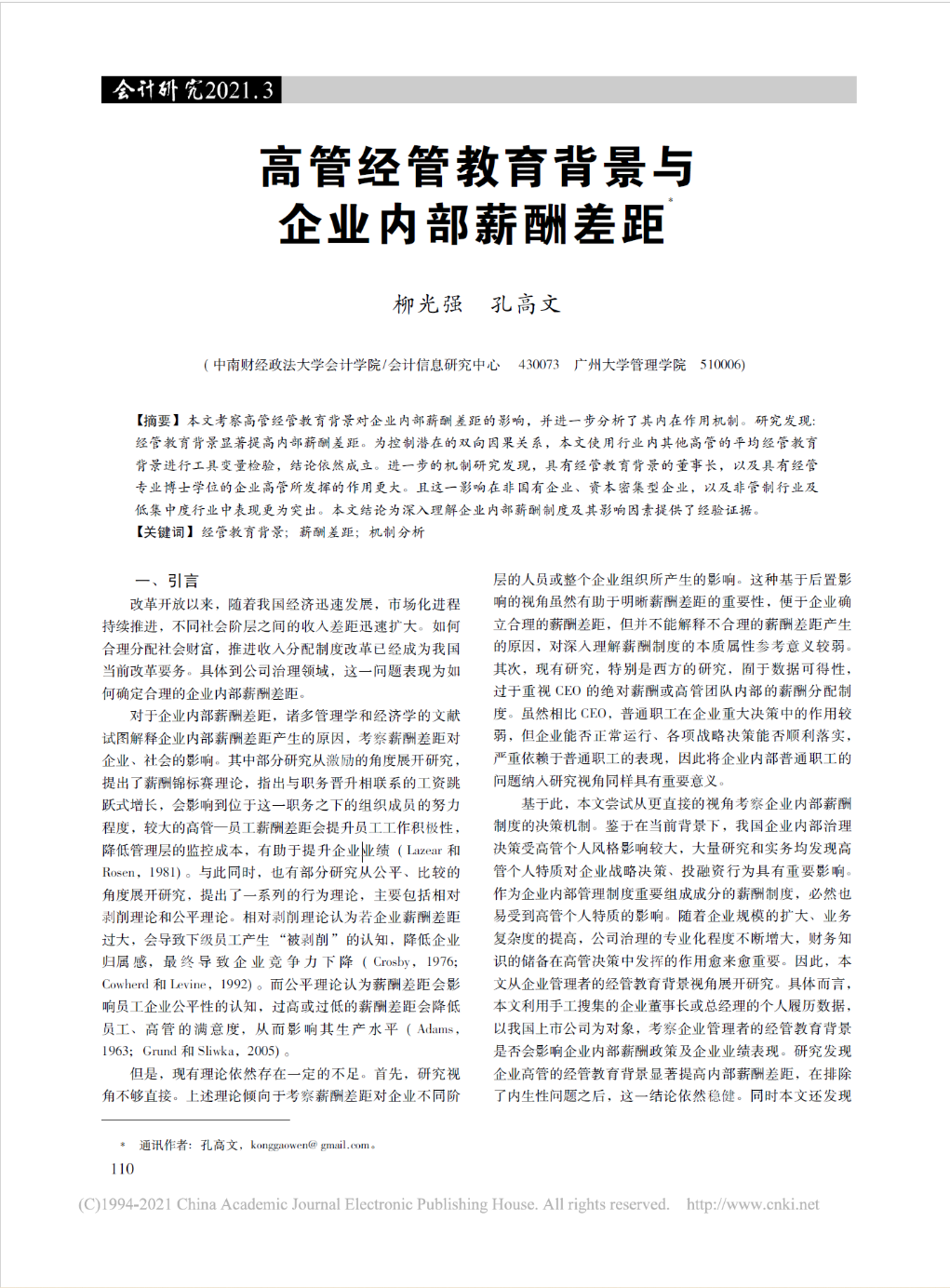 孔高文博士以通讯作者身份在《会计研究》发表文章“高管经管教育背景与企业内部薪酬差距”。
