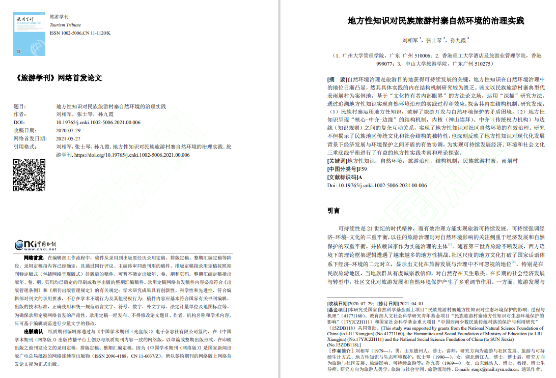 刘相军博士以第一作者身份在《旅游学刊》发表文章“地方性知识对民族旅游村寨自然环境的治理实践”。文章第二作者是香港理工大学酒店及旅游业捷克论坛