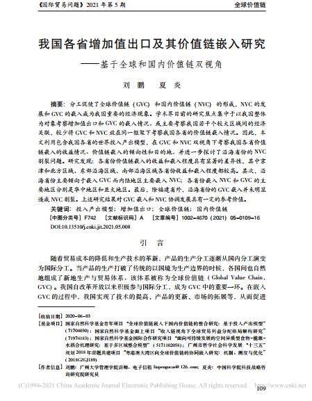 文章认为,分工促使了全球价值链(GVC)和国内价值链(NVC)的形成,NVC的发展和GVC的嵌入成为我国重要的经济现象。学术界目前的研究焦点集中于以我国整体为对象考察增加值出口和GVC的嵌入情况,或主要考察我国若干个较大区域间的经济关联,较少将GVC和NVC放在同一框架下考察我国各省的价值链嵌入情况。因此,本文利用包含我国各省的世界投入产出模型,在GVC和NVC双视角下考察我国各省价值链嵌入的收益情况、价值链嵌入的倾向性和目的地,并进一步探讨了沿海省份的NVC割裂问题。研究发现:各省份价值链嵌入的收益和嵌入程度具有显著的差异性,其中京津和北方区域、东部沿海区域、南部沿海区域各省份收益和嵌入程度都较高。其次,沿海省份主要倾向于嵌入GVC而内陆地区主要嵌入NVC;各省份嵌入NVC和GVC的主要地区分别是华中地区和亚太地区。最后,除福建省外,沿海省份的GVC嵌入并未明显造成NVC割裂。上述研究结果对GVC嵌入和NVC协调发展具有一定的参考价值。