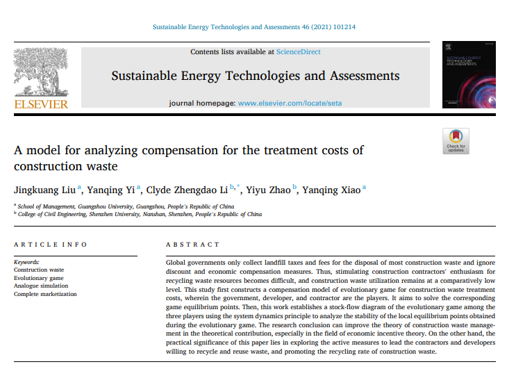 刘景矿副教授以第一作者身份发表了题为“A model for analyzing compensation for the treatment costs of construction waste”(建筑废弃物处理成本补偿模型研究)的研究成果。该论文发表于国际期刊《Sustainable Energy Technologies and Assessments》,该期刊为SCI检索,最新影响因子为2.093,在绿色、可持续科学和技术(GREEN & SUSTAINABLE SCIENCE & TECHNOLOGY)领域中排名第22/44,是JCR二区期刊。论文链接://doi.org/10.1016/j.seta.2021.101214。通讯作者为深圳大学土木与交通工程学院李政道研究员。本研究受到教育部人文社科(20YJCJH097、18YJCZH090)、广东省哲学社会科学规划(GD19CGL23)等项目资助。