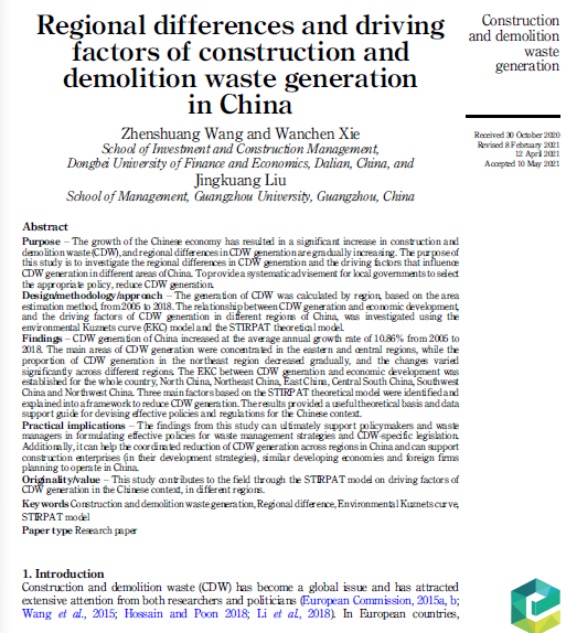 刘景矿副教授发表了题为“Regional differences and driving factors of construction and demolition waste generation in China”(中国建筑废弃物排放量的区域差异及驱动因素)的研究成果。该论文发表于国际期刊《Engineering, Construction and Architectural Management》,该期刊为SSCI检索,最新影响因子为2.162,在工程与土木(ENGINEERING, CIVIL)领域中排名第52/134,是JCR二区期刊,FMS列表C级期刊。论文链接://doi.org/10.1108/ECAM-10-2020-0887。论文第一作者为东北财经大学投资工程捷克论坛