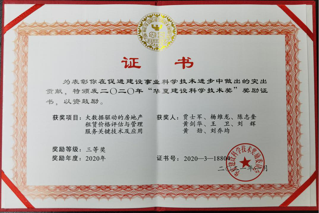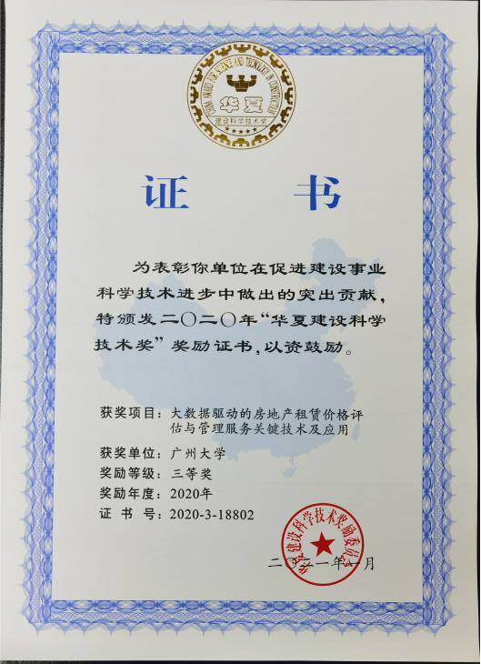 同获2020年度、由华夏建设科学技术奖励委员会颁授的“华夏建设科学技术奖”三等奖。华夏建设科学技术奖为中国建设科技领域最高级别奖。