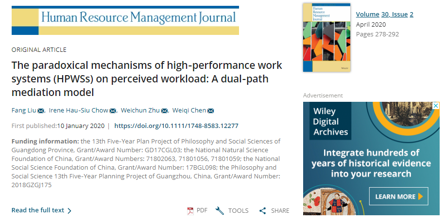 刘芳副教授(第一作者)、陈卫旗教授(通讯作者)与香港恒生大学周巧笑教授、美国Bloomsburg University of Pennsylvania朱伟春助理教授的合作研究成果《The paradoxical mechanisms of high-performance work systems (HPWSs) on perceived workload: A dual-path mediation model》,于2020年04月在人力资源领域的主流期刊《Human Resource Management Journal》第30卷第2期(278页至292页)正式发表。《Human Resource Management Journal》是JCR劳动学科(Industrial Relations & Labor)一区SSCI期刊,在Penn State University Libraries中Top HR Journals的清单中排列第二。