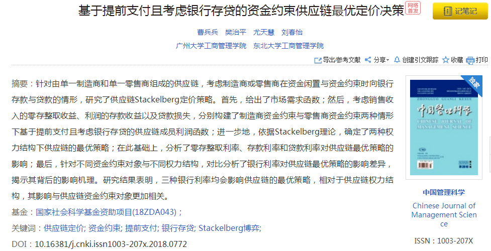 曹兵兵副教授作为第一作者的最新研究论文《基于提前支付且考虑银行存贷的资金约束供应链最优定价决策》在国家自然科学基金委管理科学部认定的A类期刊《中国管理科学》发表。该论文以资金约束供应链为背景,考虑银行存贷在供应链决策过程中的影响,创造性地构建基于提前支付且考虑银行存贷的资金约束供应链定价决策模型,给出了供应链成员的最优定价策略,并在此基础上,提出了用于指导供应链成员管理实践的对策建议。该论文的合作者包括东北大学樊治平教授与尤天慧教授等人。