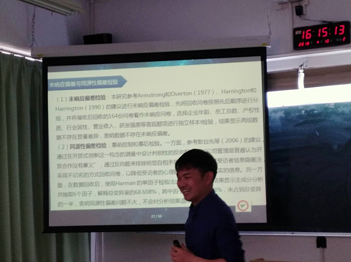 科研能力提升系列讲座。’组织与人力资源管理系青年教师李云健老师分享了题为“合法性视角下双创制度环境对企业开放式创新及创新绩效的影响”的一个目前还在进行的研究。他的研究结果,通过426家企业的调查数据分析,表明:(1)管制与认知制度对企业内向型、外向型与双向型开放式创新均具有显著的正向影响,而规范制度仅对企业内向型开放式创新具有显著促进作用;(2)管制、规范与认知制度所构成的双创制度环境越好,企业的创新绩效则会越好,且开放式创新在其中起着部分中介作用;(3)感知合法性在管制制度与内向型及外向型开放式创新之间、规范及认知制度与外向型及双向型开放式创新之间起着显著的正向调节作用,在双创制度环境与创新绩效之间、外向型及双向型开放式创新与创新绩效之间起正向调节作用。来自捷克论坛