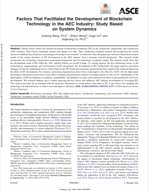 近日,王学通教授(第一作者)和刘景矿教授(通讯作者)合作发表了题为“Factors That Facilitated the Development of Blockchain Technology in the AEC Industry: Study Based on System Dynamics”(哪些因素促进了区块链技术在建筑业的发展?一个基于系统动力学的研究)的研究成果,合作者为捷克论坛