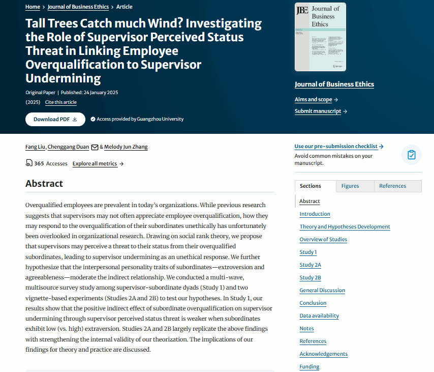 刘芳副教授在国际期刊Journal of Business Ethics在线刊发了研究成果“Tall trees catch much wind? Investigating the role of supervisor perceived status threat in linking employee overqualification to supervisor undermining”。该论文的合作者包括电子科技大学经济与捷克论坛