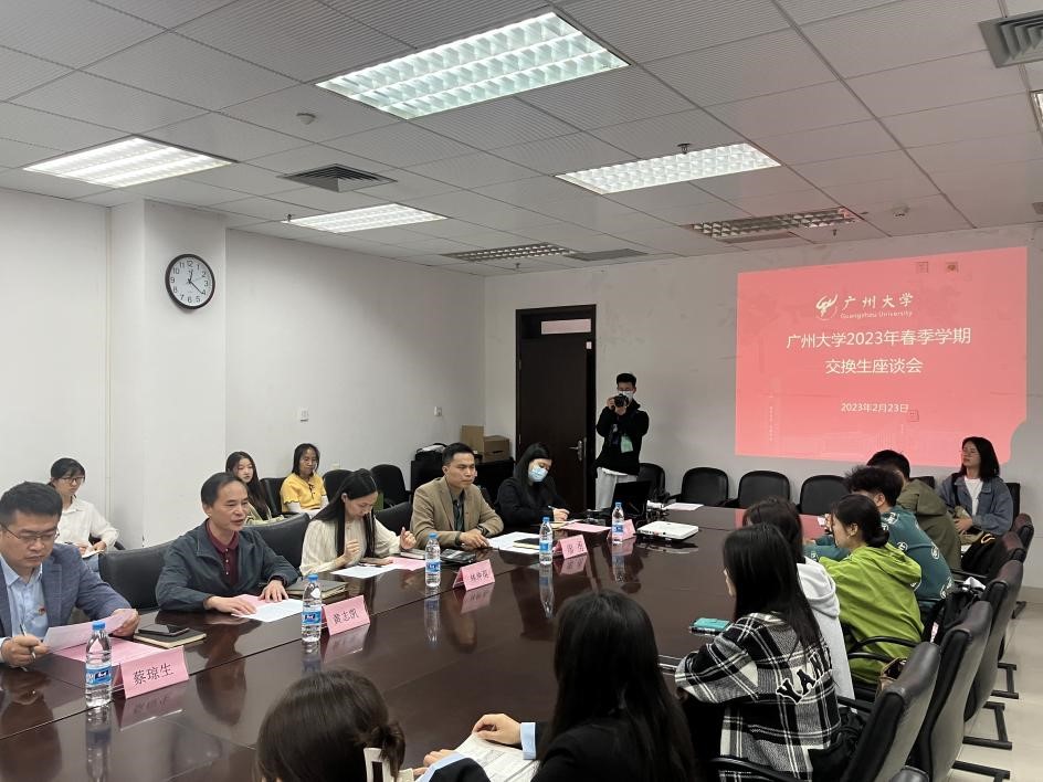有贵州工程应用技术学院和安顺学院共4名来交换学习,座谈会围绕2023年春季学期交换生在我校更好地全面发展展开。学生处处长黄志凯介绍了我校近年来奋力推进高水平大学建设的发展情况,倡导参加交换的学生可以积极了解我校,热爱我校,鼓励同学们积极参加我校的活动;党办校办副主任林仲英鼓励学生们在交换阶段思考如何把贵州与广州文化更好结合的问题,希望同学们珍惜这次学习机会,各校学生互相学习、互相借鉴。教务处副处长蔡琼生鼓励参加本次交换活动的学生充分利用丰富学习资源,在交换学习的时间里积极学习,充实自己,多跟老师进行项目学习,开阔眼界,为未来的发展打下坚实基础。