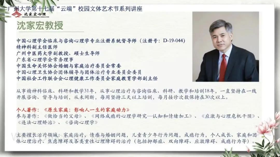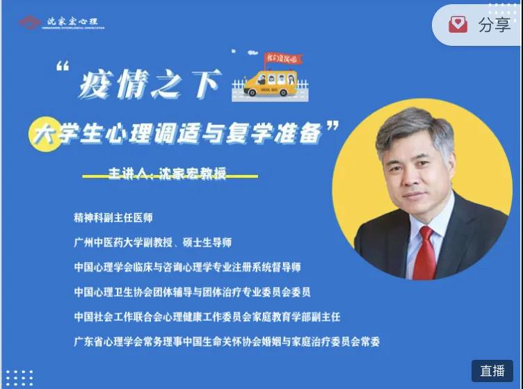 第十七届“云端”校园文体艺术节系列讲座突破三万人次观看!本次讲座由广州中医药大学副教授,广东省心理学会常务理事沈家宏教授主讲,以“疫情下大学生心理调适与复学准备”为主题。