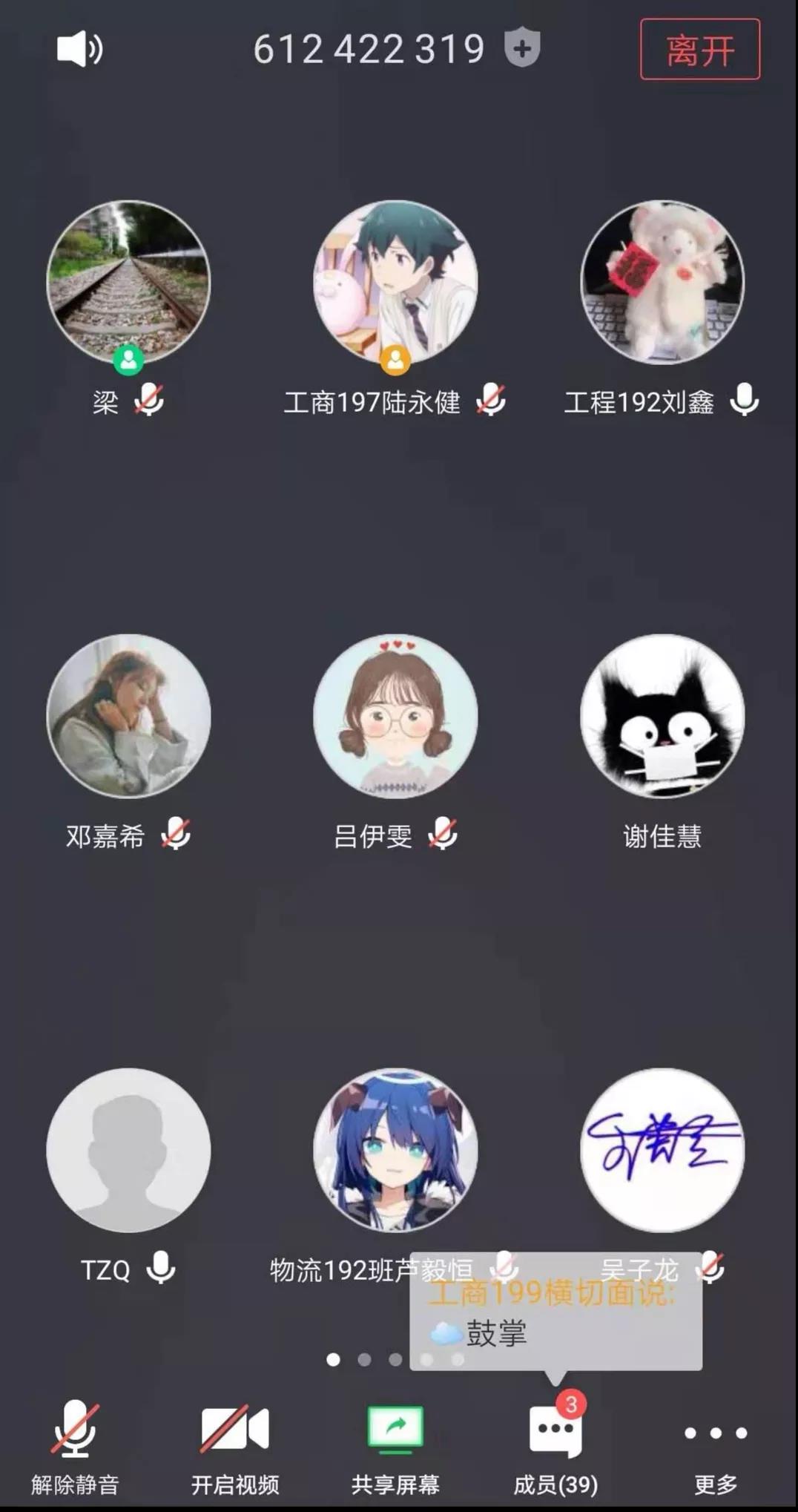 会议第三环节,老师们对开学前继续做好疫情防控和居家学习进行指导。第一,同学们要继续做好个人防护和健康汇报工作,不松弛、不懈怠、不应付。第二,做好学习网课准备。广东省各类学校2月底不开学,目前开学时间尚未确定。同学们要做好学习网课的心理准备和设备准备,做到“停课不停学”;提前搜索相关学习资料;配合老师教学,争取学习效果最大化。第三,做好时间规划,参加学院线上活动,注意在家身体锻炼,不忘学习强国。第四,要理性看待社会上一些事件,保持正能量,与国同行,为梦助力;为武汉加油,为中国加油!同学们也对开学前准备工作和下学期个人规划做了交流,期望共同进步。