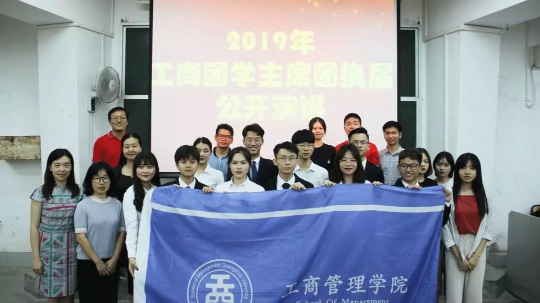 2019年5月24日晚上7:30,工商管理团委学生会于桂花岗校区11-阶三召开了2019年工商团学主席团换届公开演讲,出席本次会议的有学工办主任曾梅华老师、学工办副主任陈媛老师、团委书记周云老师、团委副书记邹婷老师、辅导员梁世健老师、助理辅导员梁荣清老师、劳科源老师、王浩老师、王科宏老师,此外参加这次公开演讲的嘉宾还有现任团委副书记黄雅芳师姐 、主席卓越师兄、副主席曾铃娜师姐、副主席李诗茗师姐、副主席柯凯丽师姐和现任人力资源部部长陈嘉仪师姐。