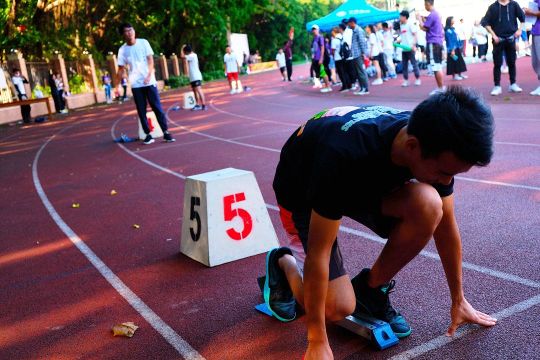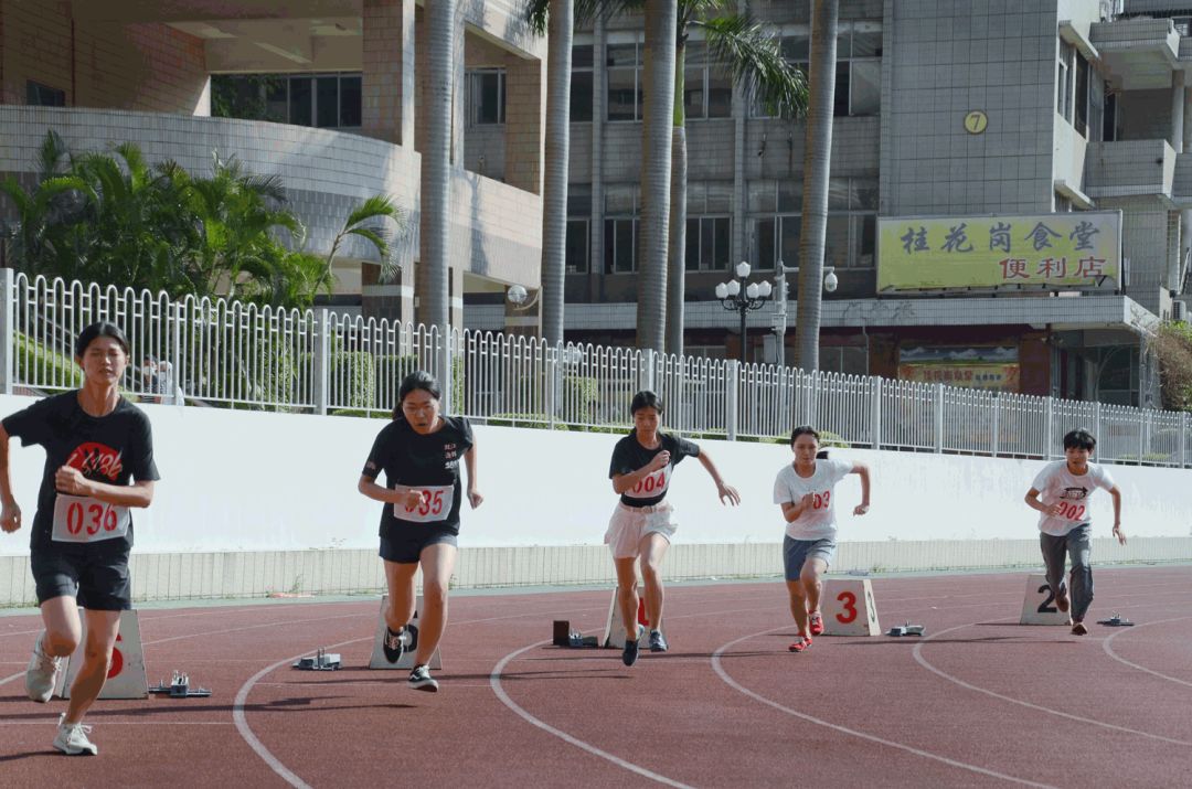 首先进行的是男子100预赛。运动健儿们迅速从开幕式的欢乐气氛里抽离出来,投入到紧张的备战状态中。随着发令枪声一响,选手们都拼尽全力向前冲去,发令枪的烟还没散尽,选手们已完成了比赛的一半。他们的眼神里写满了对胜利的渴望,表情专注而坚定,“尽力为班级和自己争取荣誉”是他们此刻唯一的目标。观众们也没有闲着,整条赛道被同学们的加油呐喊声所淹没,他们的目光紧紧追随着本班的运动员,守在终点线处的同学也早已准备好了水。不论结果如何,参赛的运动员都是他们的英雄。