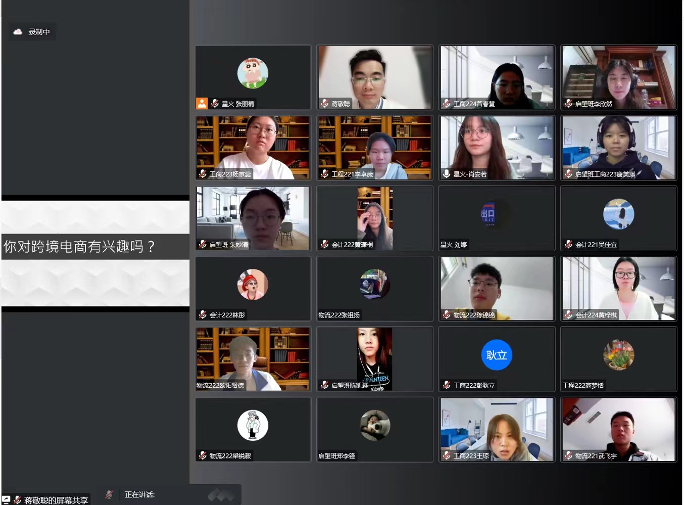 听了蒋敬聪师兄的分享后,我受益匪浅。蒋敬聪师兄和我们分享了跨境电商行业的有关知识,原本我对跨境电商有所听说但不太了解,但听了课后,我了解到了跨境电商的运作链条,知道了要想做跨境电商需要具备怎样的技能。课堂尾声,蒋师兄耐心地解答了我们的疑问。总的来说,这是一堂非常好的分享课。
