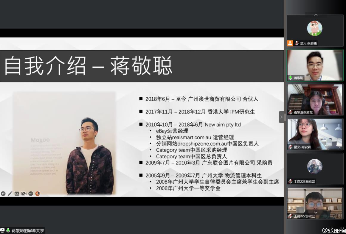 卓越训练营之“星火启创”启望班第5课在腾讯会议线上顺利开讲,授课校友导师为2009届物流管理专业的蒋敬聪校友,现任广州澳世商贸有限公司总经理。
