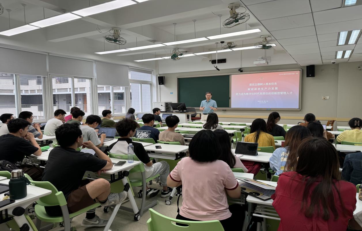 院长薛小龙教授以《落实立德树人根本任务,赋能新质生产力发展,努力成为数字化时代有责任的创新型管理人才》为题,在文新楼420室为2023级研究生开讲2024年季春季学期“思政第一课”。