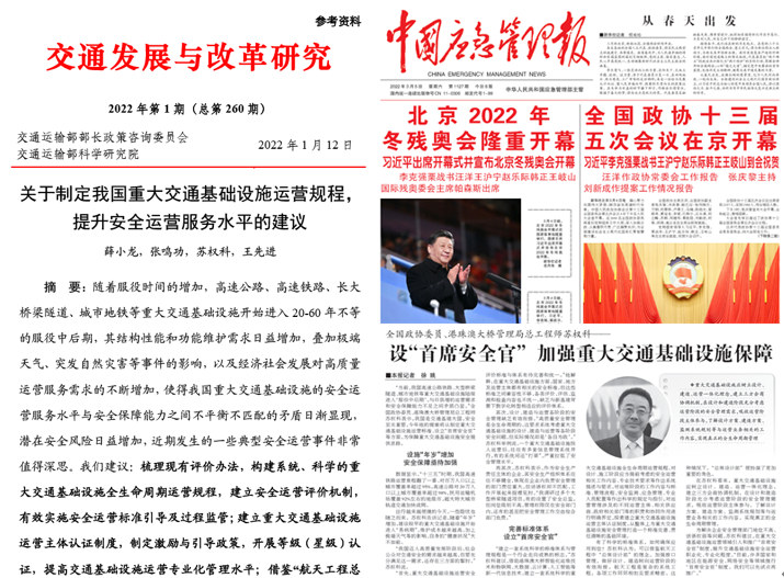 院长薛小龙教授,港珠澳大桥管理局营运发展部部长张鸣功,全国政协委员、港珠澳大桥管理局总工程师苏权科,全国政协委员、交通运输部科学研究院总工程师王先进共同整理撰写的资政建议《关于制定我国重大交通基础设施运营规程,提升安全运营服务水平的建议》(刊于《交通发展与改革研究》2022年第1期,总第260期),获国家交通运输部主要领导肯定批示。同期,该研究成果的共同作者,全国政协委员、港珠澳大桥管理局总工程师苏权科,以政协提案的方式,将此资政建议提交至全国政协十三届五次会议,获得行业和社会的广泛关注,学习强国平台、人民政协网、国家应急管理部网站、中国应急管理报、《南方》杂志,南方都市报、澎湃新闻等予以宣传报道。
