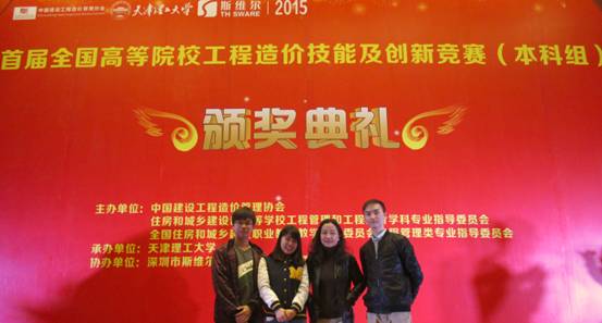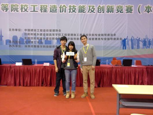工程管理专业投资与造价方向123班的邓佩仪、林旭聪、丁桂湘三位同学由庞永师院长和李军红老师带队代表我校参加了由中国建设工程造价管理协会、住房和城乡建设部高等学校工程管理和工程造价学科专业指导委员会、全国住房和城乡建设职业教育教学指导委员会主办的“首届全国高等院校工程造价技能及创新竞赛”本科组大赛,他们凭借扎实的专业功底,良好的团队合作精神,学院的大力支持和老师悉心的指导,从来自全国74所高等院校中脱颖而出,取得了本次竞赛团体二等奖,一个单项一等奖的好成绩,参赛的三名队员由于本次竞赛的优异成绩同时免试获得中国建设工程造价管理协会颁发的相关专业资格证书,两位带队老师获优秀指导老师称号。