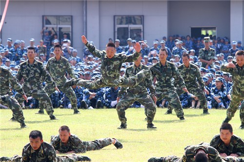 持枪代表方阵斗志昂扬、口号响亮、用整齐划一的步伐走过主席台,完美的表现让现场掌声雷动。“弓步冲拳、交错侧踹······”一套完整的军体拳表演展现出军人的风采。在表演的最后中,学子们摆出“广大”字样并响亮喊出“博学笃行,与时俱进”的校训象征着学校学院欣欣向荣的一面。期间,枪支分解方阵娴熟地进行枪支拆装,而消防自救演练则展示了学子们所学的消防自救知识。教官的压轴表演更是精彩绝伦,整齐的“倒弓”表演,响亮的口号,无不体现军人们铁一般的气概。