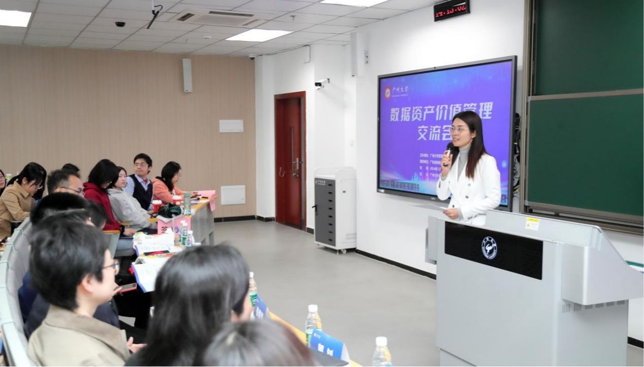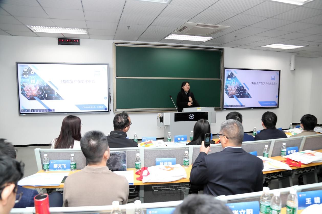 会计系主任黎文飞副教授主持。广州数据交易所生态合作部总经理助理、CDE数据学院负责人王琳做“数据价值洞察及数据资产管理实践”主题演讲。她详细介绍广东数据交易所对数据资产化实践的观察和经验,深入剖析了数据价值洞察的要点和方法,强调数据产品化和数据应用场景的重要性,以及进行数据产权登记和数据质量管理的必要性。