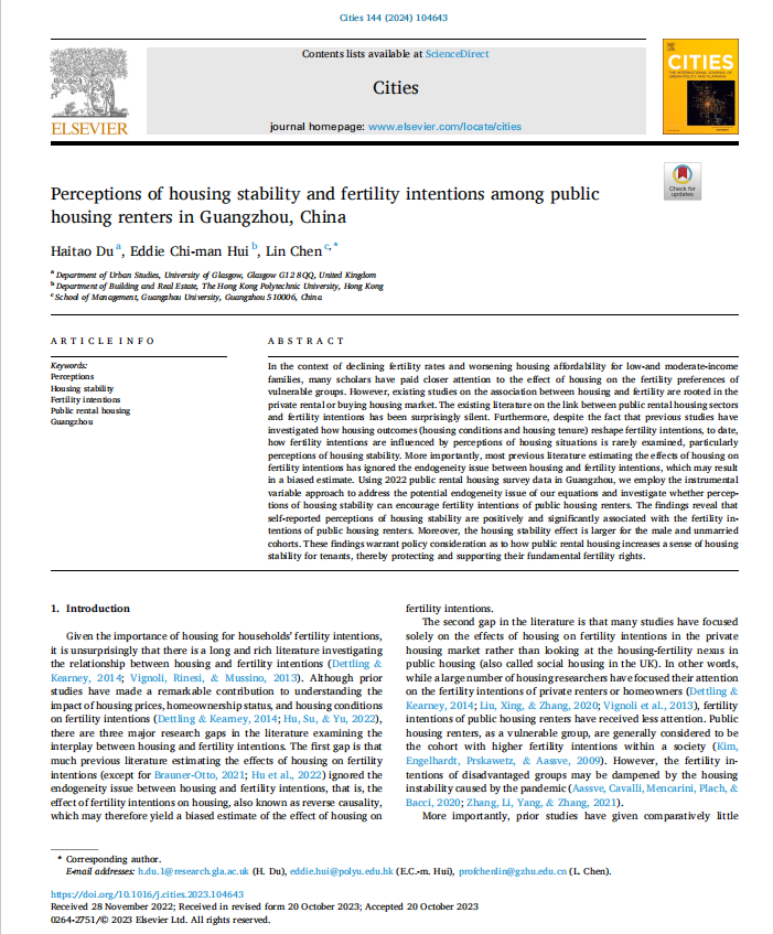 陈琳教授(通讯作者)在国际知名期刊《Cities》发表了题为“Perceptions of Housing Stability and Fertility Intentions among Public Housing Renters in Guangzhou, China ”的研究成果,合作者另有英国格拉斯哥大学城市研究系的博士生杜海涛和香港理工大学建筑与房地产系的Eddie Chi-man Hui教授。《Cities》为SSCI检索,中国科学院一区,最新影响因子为6.7,在城市研究领域(URBAN STUDIES)中排名3/72。该研究受到国家社会科学基金项目“新市民住房长效机制构建研究”(19BGL220)的资助。