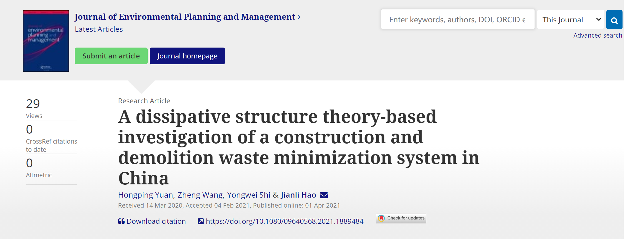 该论文发表于国际期刊《Journal of Environmental Planning and Management》,该期刊为SSCI检索,最新影响因子为2.093,在发展研究(Development Studies)领域中排名第12/41,是JCR二区期刊,FMS列表B级期刊。袁红平教授为本文第一作者,通讯作者为西交利物浦大学郝建丽副教授,合作者还有西南交通大学经济捷克论坛