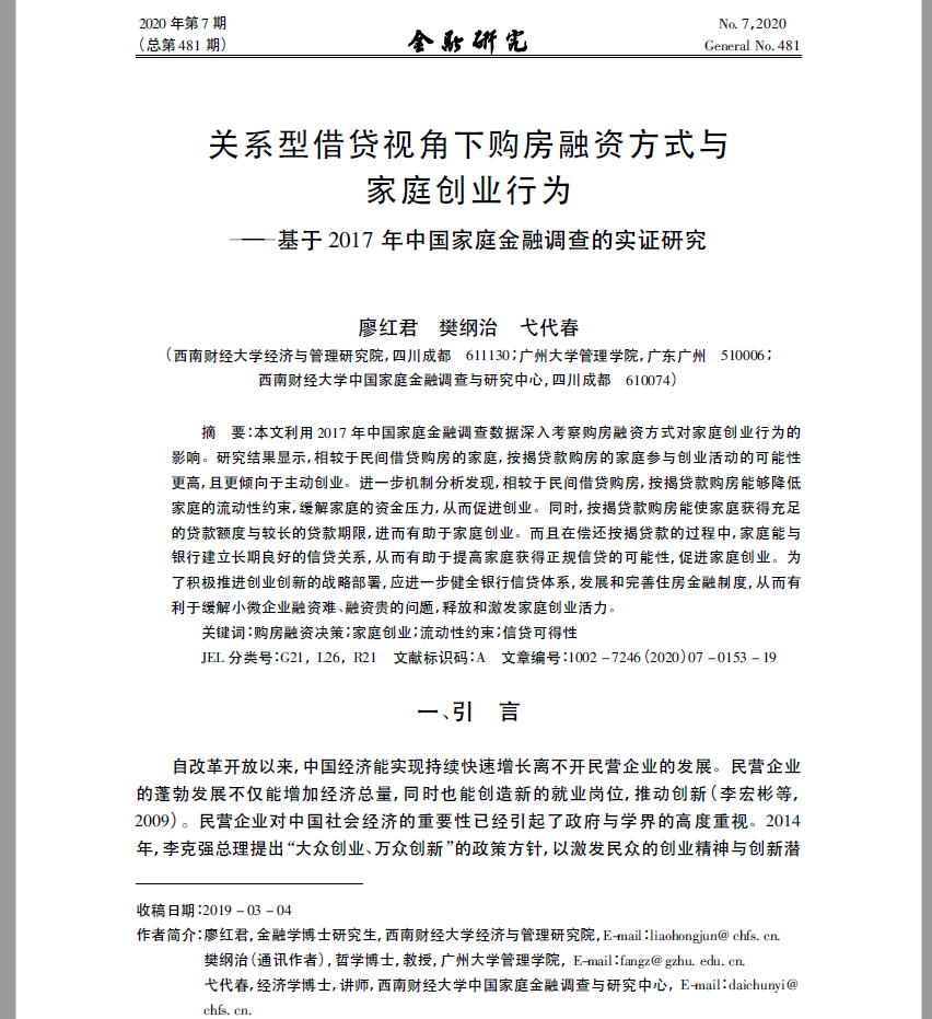 樊纲治教授的论文“关系型借贷视角下购房融资方式与家庭创业行为—基于2017年中国家庭金融调查的实证研究”在《金融研究》2020年第7期发表。《金融研究》是国家自然科学基金委管理科学部认定的A类期刊,2019年综合影响因子:5.16。论文第一作者为西南财经大学经济与管理研究院博士生廖红君,樊纲治教授为本文通讯作者。