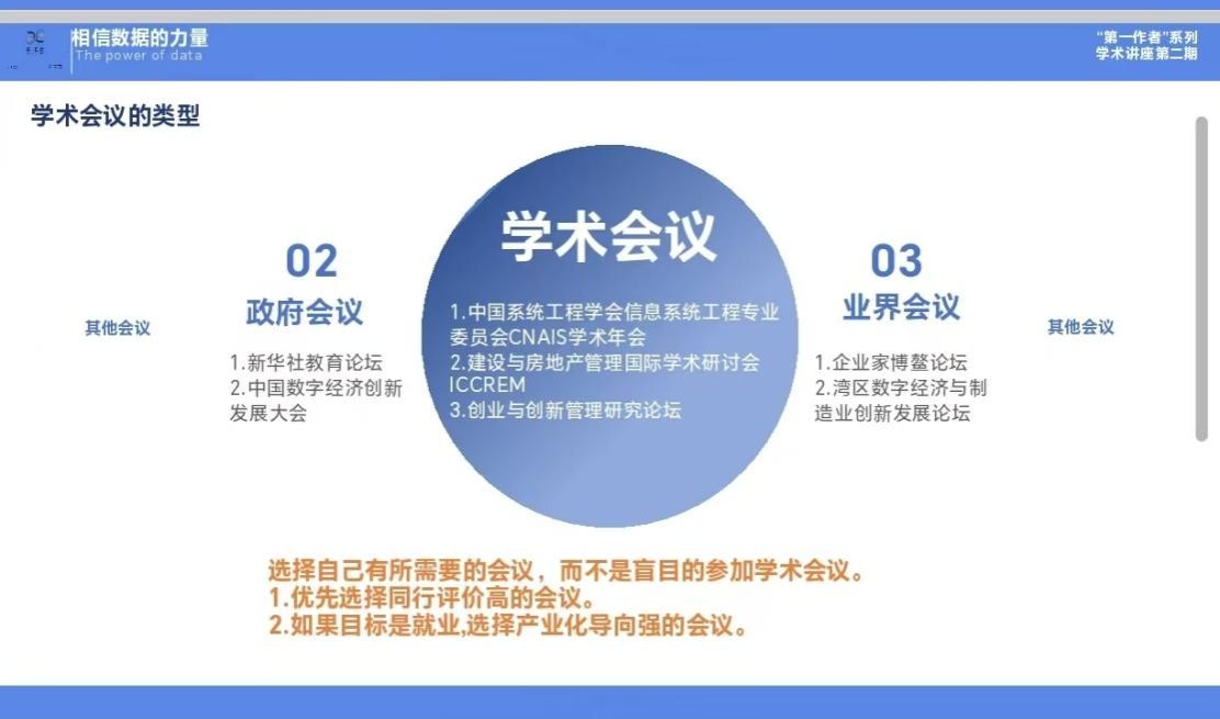 在学术会议方面,陈建硕博士分别从聆听学术报告、认识期刊主编、与竞争对手比较、展示研究成果四个方面分享了自己的感悟。他建议同学们选择自己有所需要的会议,而不是盲目的参加学术会议。尤其提到参与学术会议的类型与重要性:洞悉最新的研究方向与热点问题,可能接触到心仪的导师,为自身学术发展开拓全新的方向;创造学术发表的契机,搭建起合作的桥梁,助力研究成果更顺畅地得到学界认可;通过借鉴他人的优势,持续优化自己的研究方法与技巧。